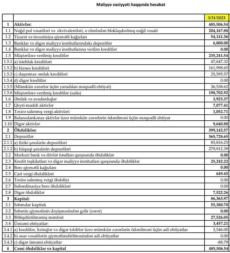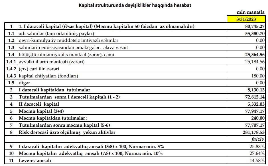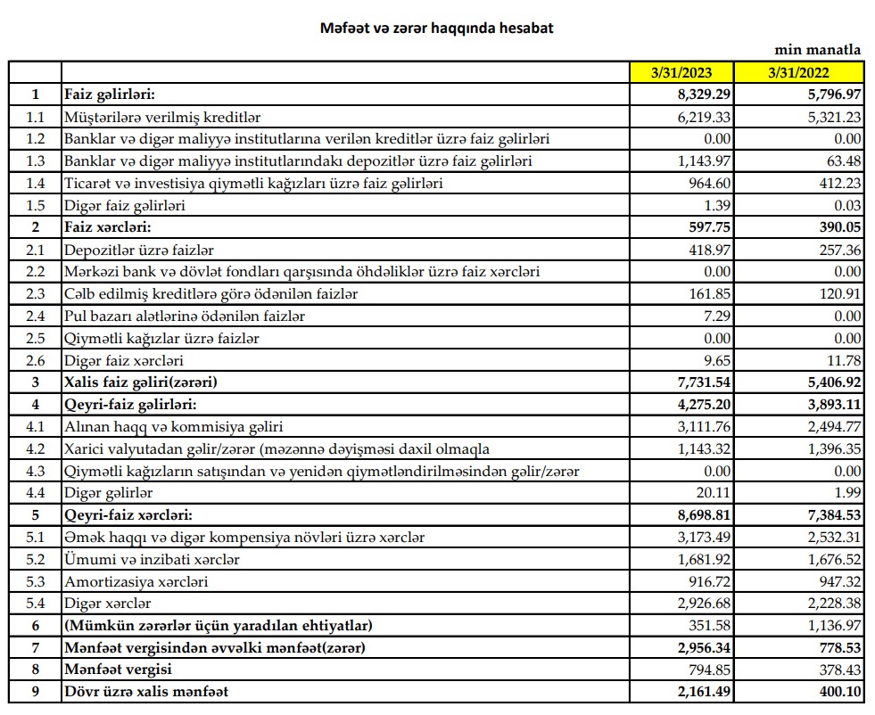 Türkiyənin "Yapı Kredi" bankının Azərbaycanda törəməsi olan "Yapı Kredi Bank Azərbaycan" QSC 2023-cü ilin 1-ci rübünü 2 milyon 161 min manat xalis mənfəət ilə başa vurub. Bank 2022-ci ilin 1-ci rübünü 400 min manat xalis mənfəət ilə bağlamışdı. Beləliklə, 2022-ci ilin ilk rübü ilə müqayisədə 2023-cü ilin ilk rübündə "Yapı Kredi Bank Azərbaycan"ın xalis mənfəəti 5,4 dəfə artıb. Xalis mənfəətin artması gəlirlərin artmasından və mümkün zərərlər üçün yaradılan ehtiyatlara ayrılan vəsaitin 3 dəfədən çox azalması ilə əlaqədardır.