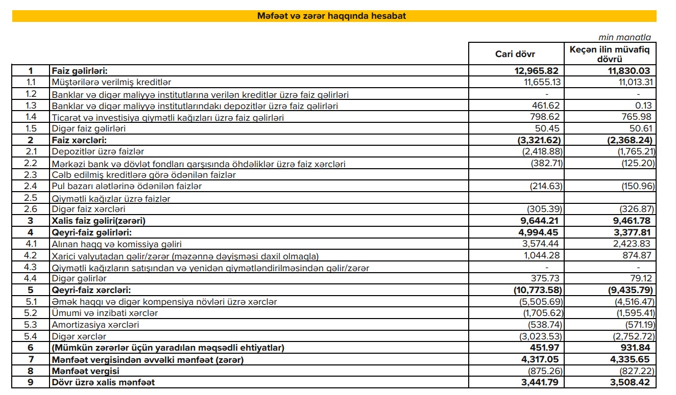 2022-ci ilin müvafiq dövrü ilə müqayisədə Bankın gəlirləri 18% artaraq, 17 milyon 960 min manat olub. Bank gəlirlərinin 12 milyon 966 min manatını faiz gəlirləri, 4 milyon 995 min manatını isə qeyri-faiz gəlirləri təşkil edib.