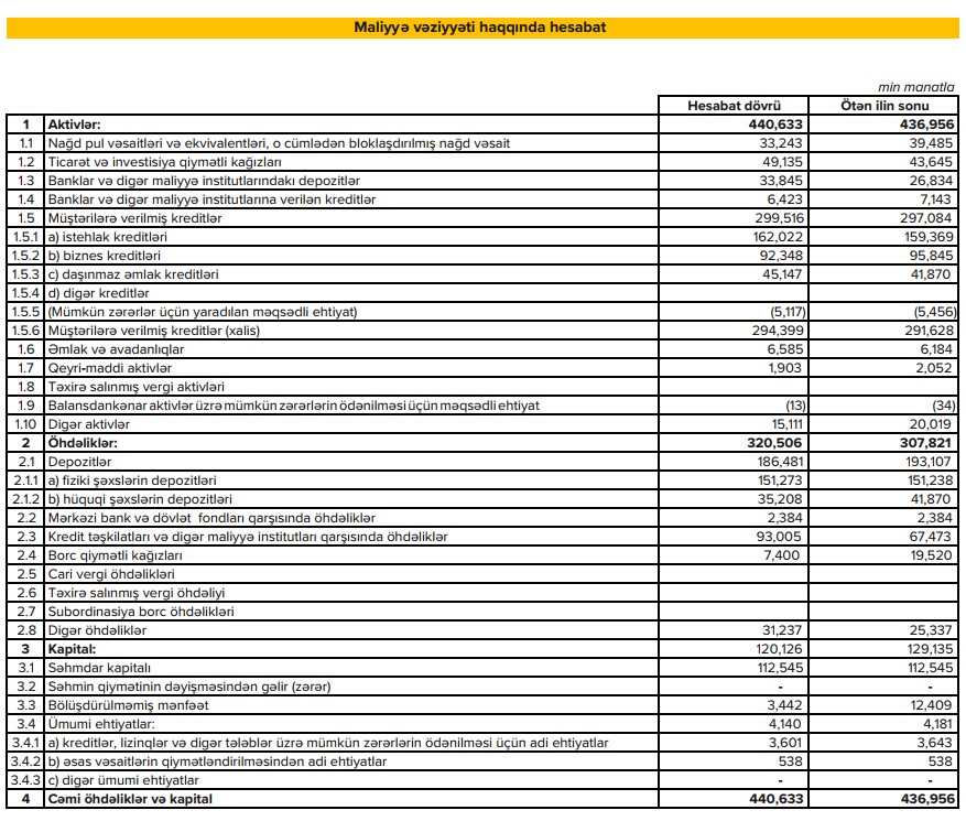 Qeyd edilib ki, cari ilin ilk rübü üzrə Bankın kredit portfelinin həcmi 299 milyon 516 min manat olub ki, bu da ötən ilin eyni dövründən 14% yüksəkdir.