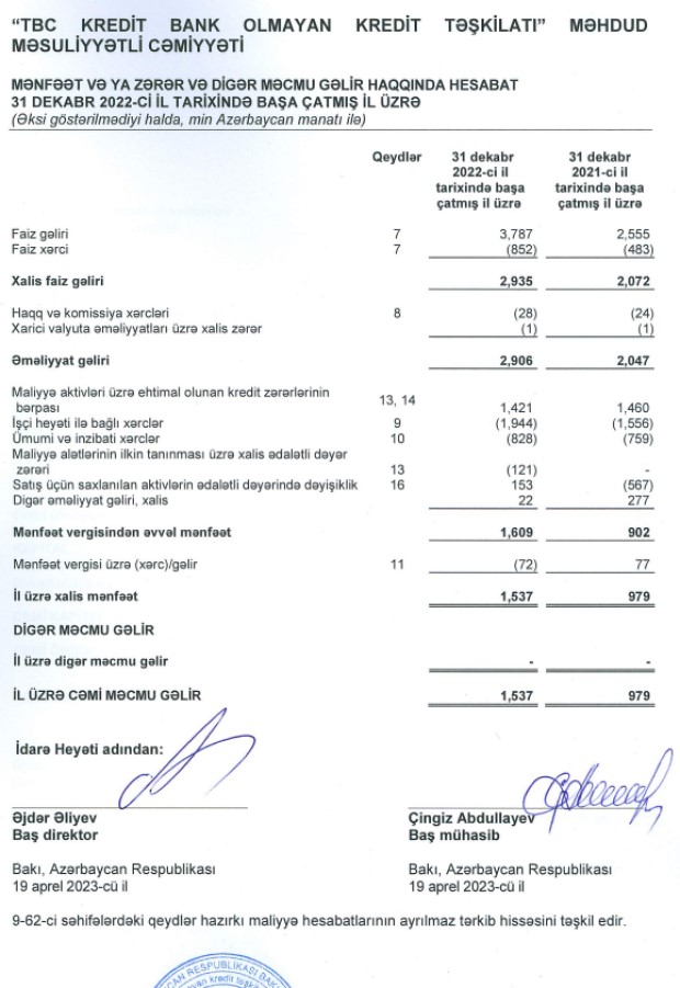 "TBC Kredit Bank Olmayan Kredit Təşkilatı" MMC 2022-ci ili 1 milyon 537 min manat xalis mənfəət ilə başa vurub. Təşkilat 2021-ci ili 979 min manat xalis mənfəət ilə bağlamışdı. Beləliklə, "TBC Kredit"in xalis mənfəəti 2021-ci illə müqayisədə 2022-ci ildə 558 min manat və ya 58% artıb.