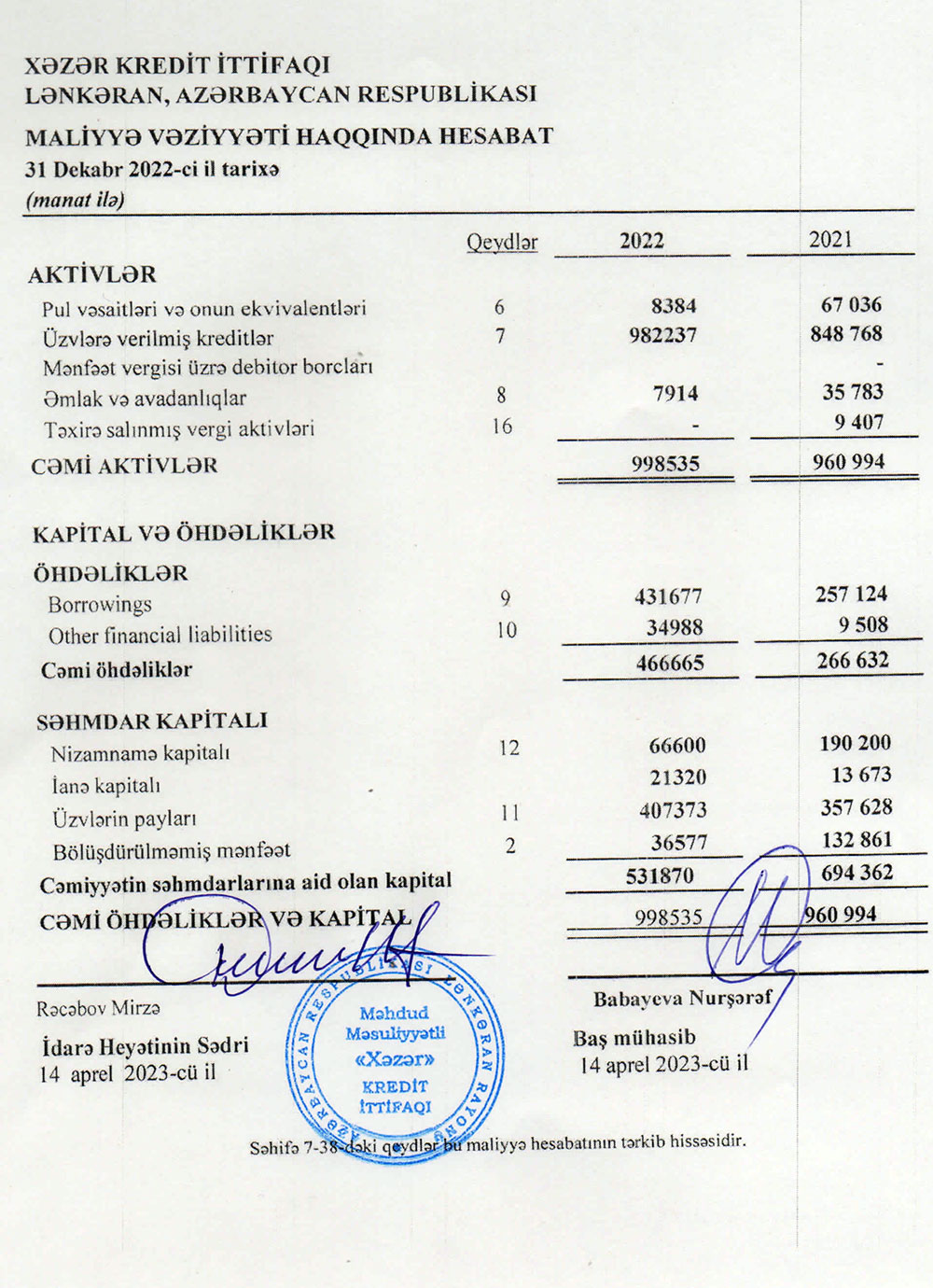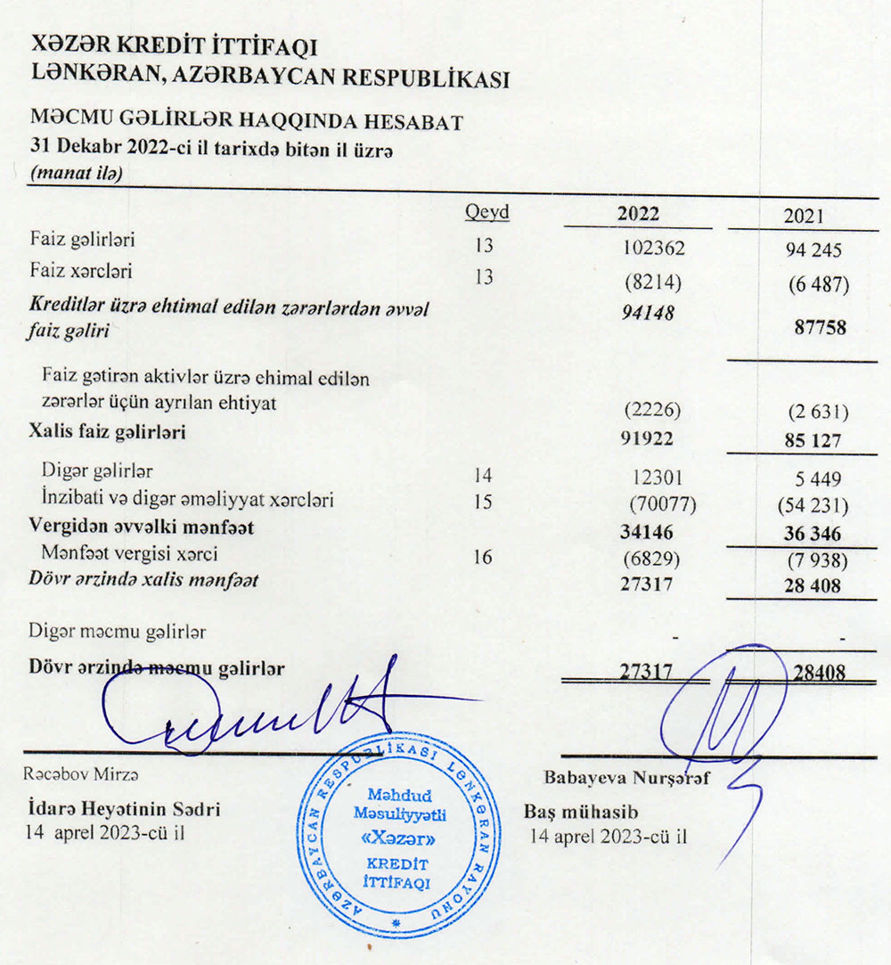 Lənkəranda fəaliyyət göstərən "Xəzər Kredit İttifaqı"nın 31 Dekabr 2022-ci il tarixinə maliyyə hesabatları.