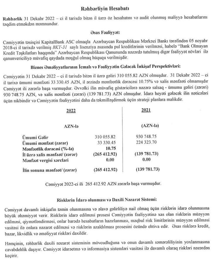Əsas vəsaitlər və digər aktivlərin dəyərdən düşməsi üzrə zərər, inzibati və əməliyyat xərcləri ilə əlaqədar olaraq "BirKart BOKT" MMC 2022-ci ili 265 min 413 manat xalis zərər ilə bağlayıb.