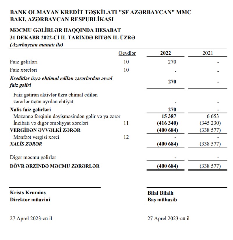"SF Azərbaycan" BOKT MMC-nin 2022-ci il üzrə maliyyə hesabatları