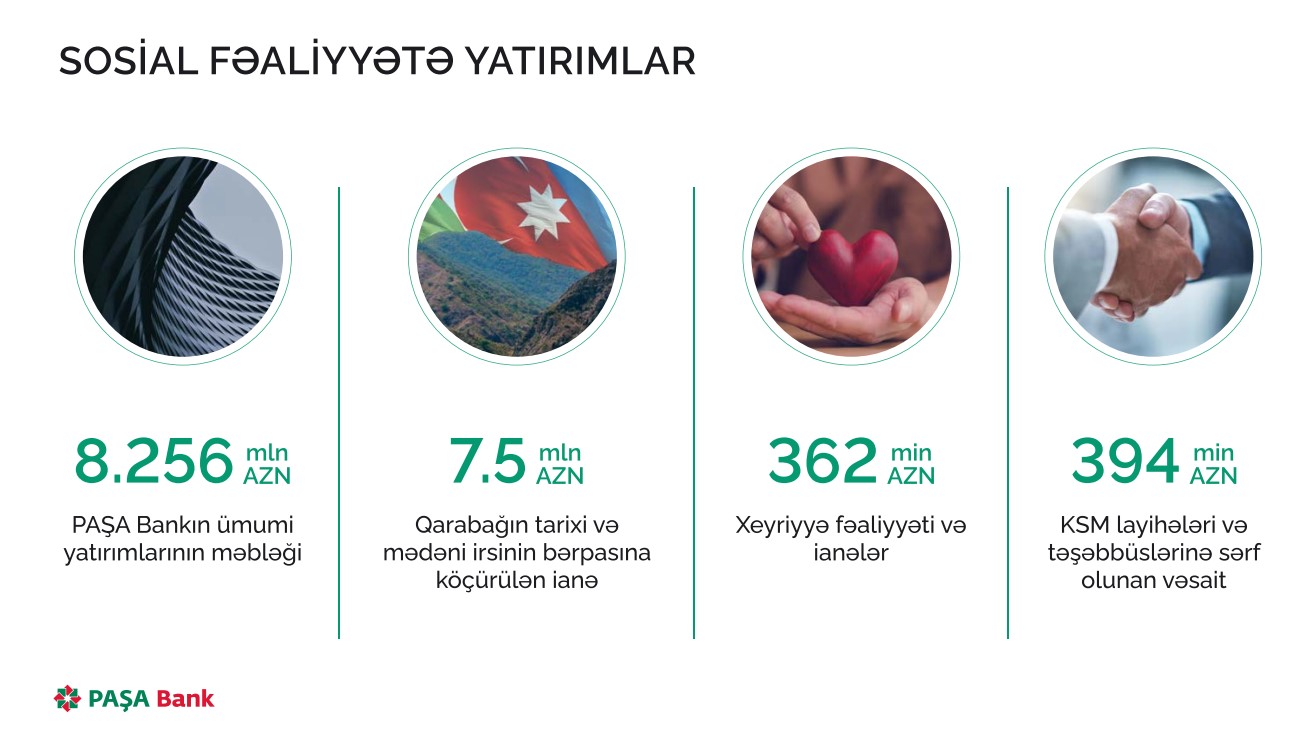 Marja.az-ın məlumatına görə, 2022-ci il üzrə fəaliyyət nəticələrinə həsr olunmuş mətbuat konfransında "PAŞA Bank" ASC-nin Komplayns və idarəetmə üzrə Baş direktoru Anar Kərimov bildirib ki, ötən il Bank sosial fəaliyyətlərə 8 milyon 256 min manat xərcləyib.