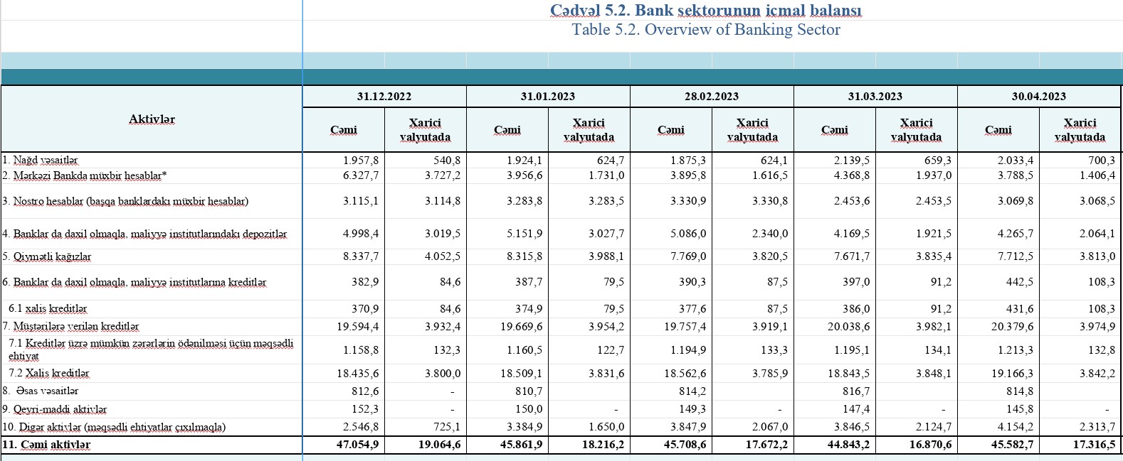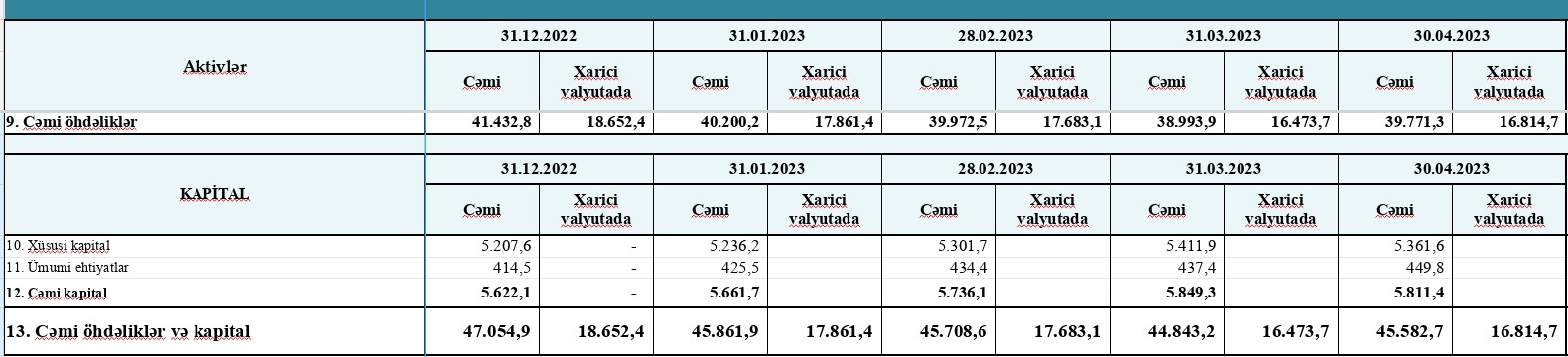 30 aprel 2023-cü il tarixinə fəaliyyətdə olan bankların cəmi aktivləri 45 milyard 582.7 milyon manat, cəmi öhdəlikləri 39 milyard 771.3 milyon manat, balans kapitalı 5 milyard 811.4 miylon manat olmuşdur.