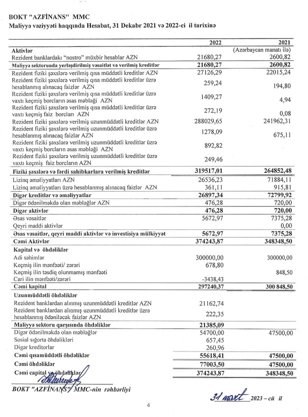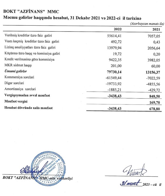 BOKT "Azfinans" MMC 2021-ci ili 3 min 438 manat xalis zərər ilə başa vurub. Təşkilat 2021-ci ili 679 mnaat xalis mənfəət ilə bağlamışdı.