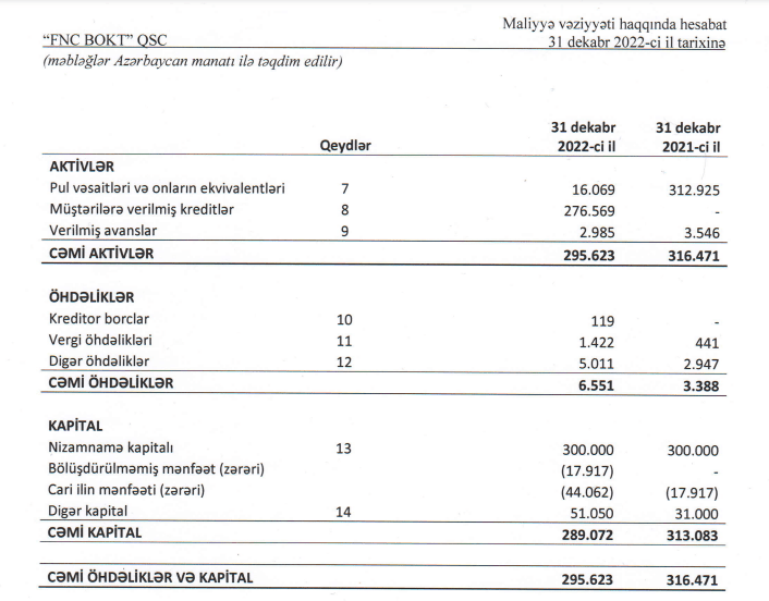 31 dekabr 2022-ci il tarixində “FNC BOKT”ın kredit portfeli (müştərilərə verilmiş kreditlər) 277 min manat təşkil edib.