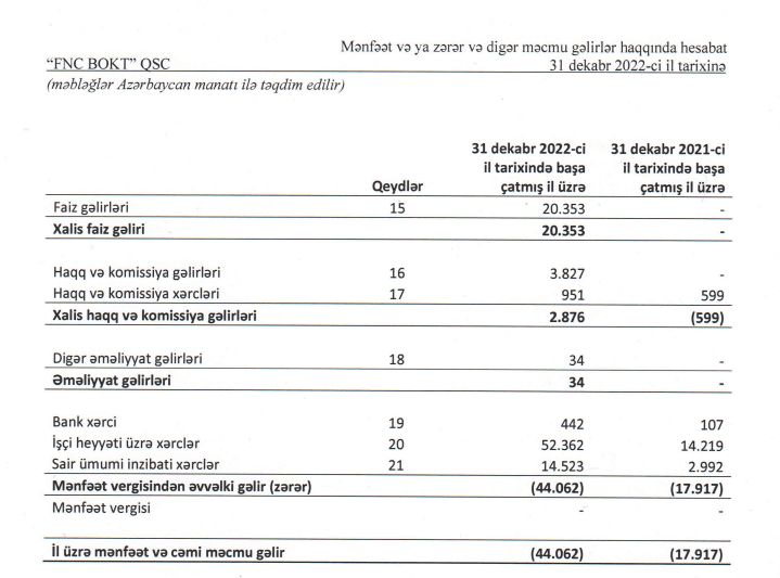 Marja xəbər verir ki, ötən il “FNC BOKT”ın faiz gəlirləri 20 min manat təşkil edib. Təşkilat 2021-ci ildə faiz gəlirləri əldə etməmişdi.