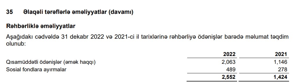 2022-ci ildə Mərkəzi Bankın rəhbərliyinə ödənişlər isə 2 milyon 552 min manat təşkil edib (2021-ci ildə 1 milyon 424 min manat).