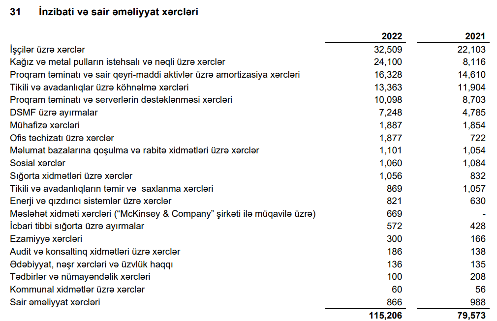 2022-ci ildə Azərbaycan Respublikası Mərkəzi Bankının inzibati və sair əməliyyat xərcləri 115 milyon 206 min manat təşkil edib.