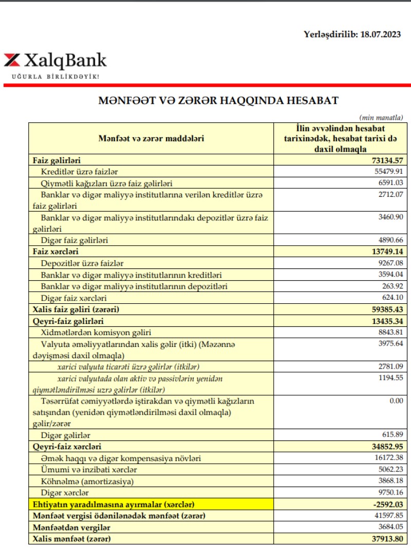 2023-cü ilin birinci yarısında 2022-ci ilin birinci yarısı ilə müqayisədə "Xalq Bank"ın faiz gəlirləri 43,3% artaraq 73 milyon 134 min manata, qeyri-faiz gəlirləri isə 41% aratraq 13 milyon 435 min manata yüksəlib. "Xalq Bank"ın qiymətli kağızlar üzrə faiz gəlirləri, digər banklardakı depozitlər üzrə faiz gəlirləri kəskin artıb.