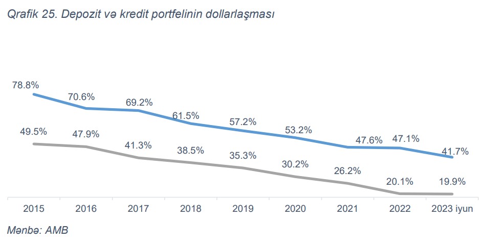 Mərkəzi Bank bildirib ki, 2023-cü ilin birinci yarısında bank sisteminin depozit porfelinin dollarlaşması 5.4 f.b azalaraq 41.7%, kredit portfelinin dollarlaşma səviyyəsi isə 0.2 f.b azalaraq 19.9% təşkil etmişdir.