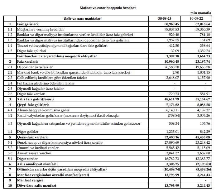 2023-cü ilin 1-ci rübündə 702 min manat, 2-ci rübündə 1 milyon 522 min manat əməliyyat mənfəəti əldə etmiş "Yelo Bank" ASC, 3-cü rübündə 1 milyon 82 min manat əməliyyat mənfəəti təmin etməyə nail olub.