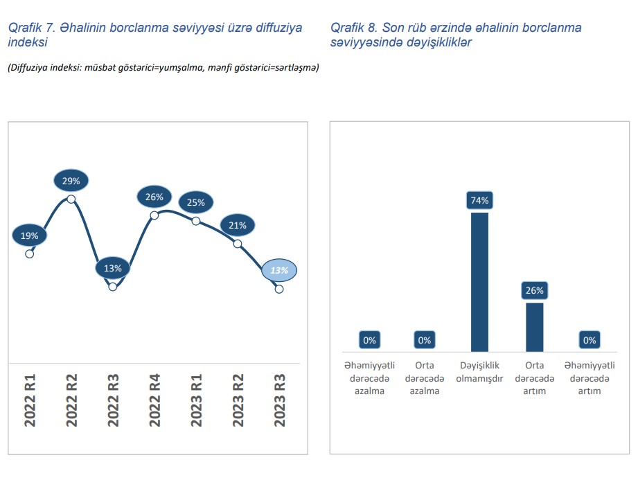 Marja.az-ın məlumatına görə, sorğu nəticələrində bildirilir ki, kreditləşmə fəaliyyətinə dair sorğunun 3-cü rüb üzrə nəticələrinə əsasən əhalinin borclanma səviyyəsində ciddi artım müşahidə edilməmişdir. Belə ki, respondent bankların 74%-i əhalinin borclanma səviyyəsində dəyişiklik olmadığını, 26%-i isə orta dərəcədə artım olduğunu bildirmişdir.