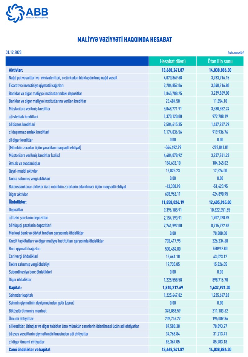 "ABB" ASC 14 milyard manata yaxın cəmi aktivləri ilə Azərbaycanda ən böyük bankdır. 31 dekabr 2023-cü il tarixində Bank 13 milyard 668 milyon 242 min manat cəmi aktivlərə malik olub. Ötən il, ABB-nin cəmi aktivləri digər banklar və maliyyə institutlarındakı depozitlərin azaldılması ilə əlaqədar olaraq cüzi düşsə də, kredit portfeli 5 milyard manat səviyyəsini keçib. Belə ki, ABB-nin cəmi kredit portfeli 2023-cü ildə 2022-ci illə müqayisədə 1 milyard 518 milyon 189 min manat və ya 43% artaraq 5 milyard 48 milyon 772 min manata çatıb. O cümlədən, ABB-nin istehlak kreditləri portfeli 397 milyon 412 min manat artaraq 1 milyard 370 milyon 120 min manata, biznes kreditləri portfeli 866 milyon 678 min manat və ya 53% artaraq 2 milyard 504 milyon 615 min manata, ipoteka kreditləri portfeli 254 milyon 100 min manat və ya 26,7% artaraq 1 milyard 174 milyon 36 min manata çatıb.