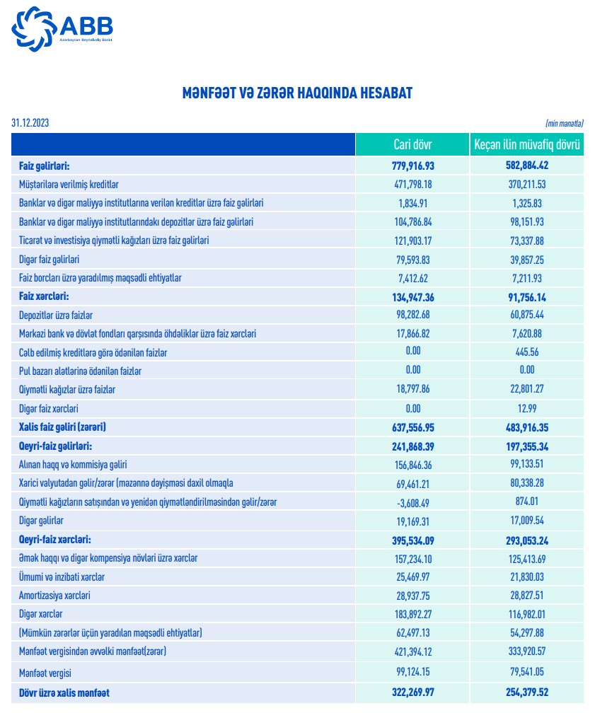 "ABB" ASC (Azərbaycan Beynəlxalq Bankı) 2023-cü ili 322 milyon 270 min manat xalis mənfəətlə başa vurub. Bank 2022-ci ili 254 milyon 380 min manat xalis mənfəətlə bağlamışdı.