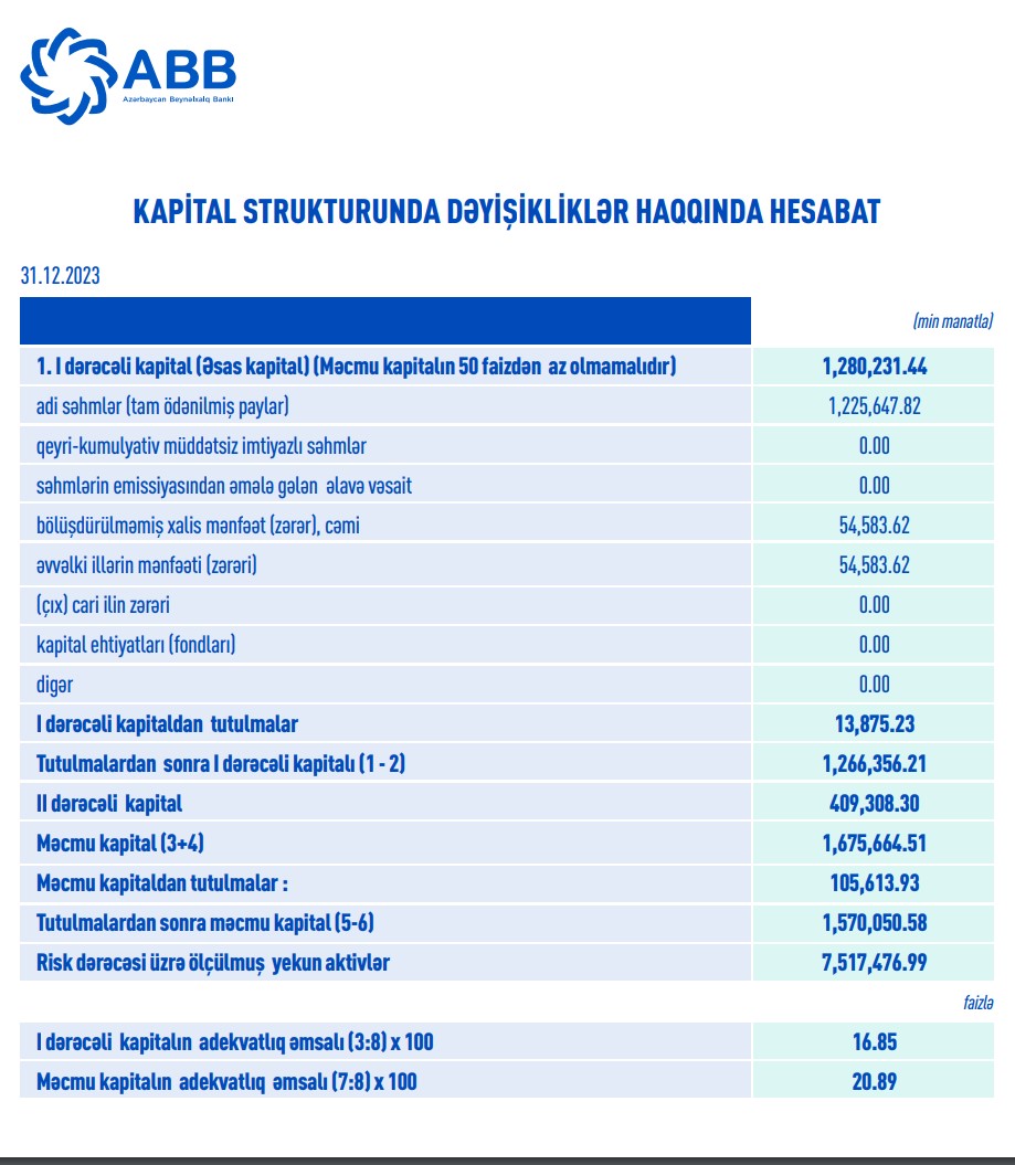 31 dekabr 2023-cü il tarixində "ABB" ASC 1 milyard 570 milyon manat məcmu kapitala malik olub. 2023-cü ilin sonunda ABB-də I dərəcəli kapitalın adekvatlıq əmsalı 16,85% (sistem əhəmiyyətli banklar üzrə miniumum 6%), məcmu kapitalın adekvatlıq əmsalı 20,89% (sistem əhəmiyyətli banklar üzrə minimum 12%), Leverec əmsalı 9,13% (sistem əhəmiyyətli banklar üzrə minimum 5%) təşkil edib.