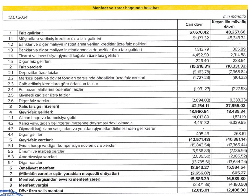 "Expressbank" ASC 2023-cü ili 12 milyon 15 min manat xalis mənfəət ilə başa vurub. Bank 2022-ci ili 12 milyon 409 min manat xalis mənfəətlə bağlamışdı. Xalis mənfəətin cüzi azalması mümkün zərərlər üçün yaradılan məqsədli ehtiyata ayırılan vəsait ilə əlaqədardır. Ötən il Bankın əməliyyat mənfəəti 2 milyon 559 min manat artıb.