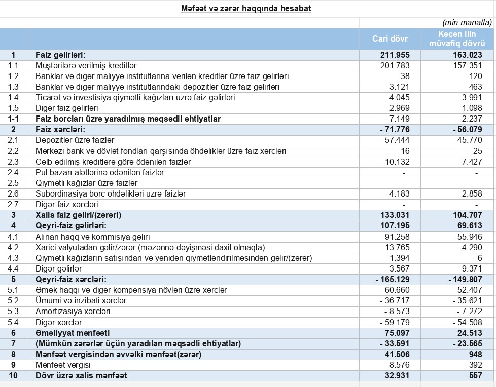 Müqayisə üçün qeyd edək ki, 2022-ci ildə “Unibank”ın cəmi əməliyyat gəlirləri 232 milyon 637 min manat, cəmi əməliyyat xərcləri 208 milyon 123 min manat, əməliyyat mənfəəti 24 milyon 513 min manat, ehtiyata ayrılan vəsait 23 milyon 564 min manat, ödənilən mənfəət vergisi 392 min manat təşkil etmişdi.