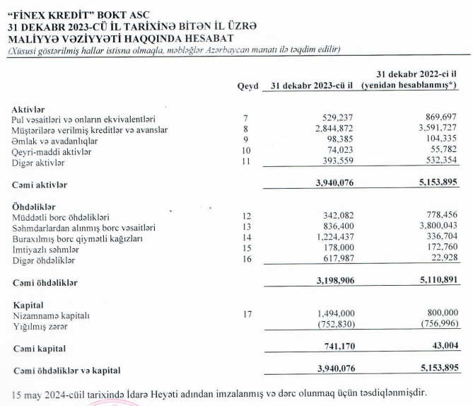 Ötən il “Finex Kredit”in kredit portfeli (müştərilərə verilmiş kreditlər) 3 milyon 592 min manatdan 2 milyon 845 min manata geriləyib. Təşkilatın cəmi aktivləri isə 5 milyon 154 min manatdan 3 milyon 940 min manata düşüb.