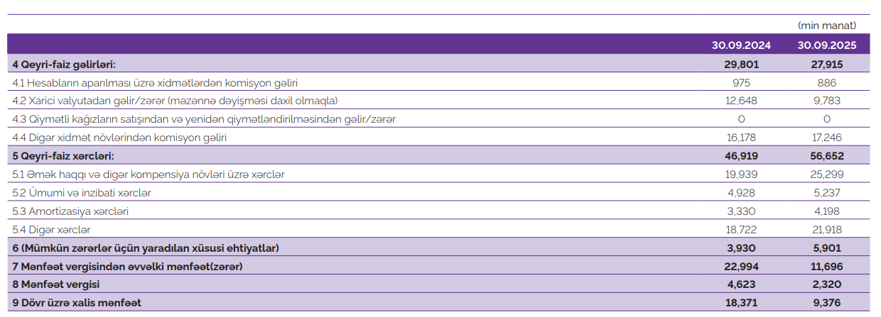 Azər-Türk Bank 2025-ci ilin doqquz ayını 9,3 milyon manat xalis mənfəət ilə başa vurub. Bu, hər ay orta hesabla 1 milyon manatdan çox xalis mənfəət təmin etmək deməkdir.