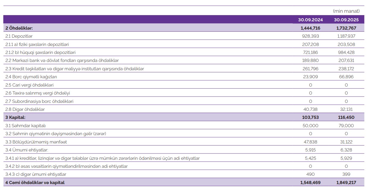 Hesabat dövrü ərzində Bankın depozit portfelinin həcmi 1,2 milyard manat təşkil etmişdir ki, bu da ötənilki göstəricidən 28% çoxdur. Cari ilin üçüncü rübünün sonuna cəmi bank öhdəliklərinin həcmi 1,7 milyard manat səviyyəsində olmuşdur.