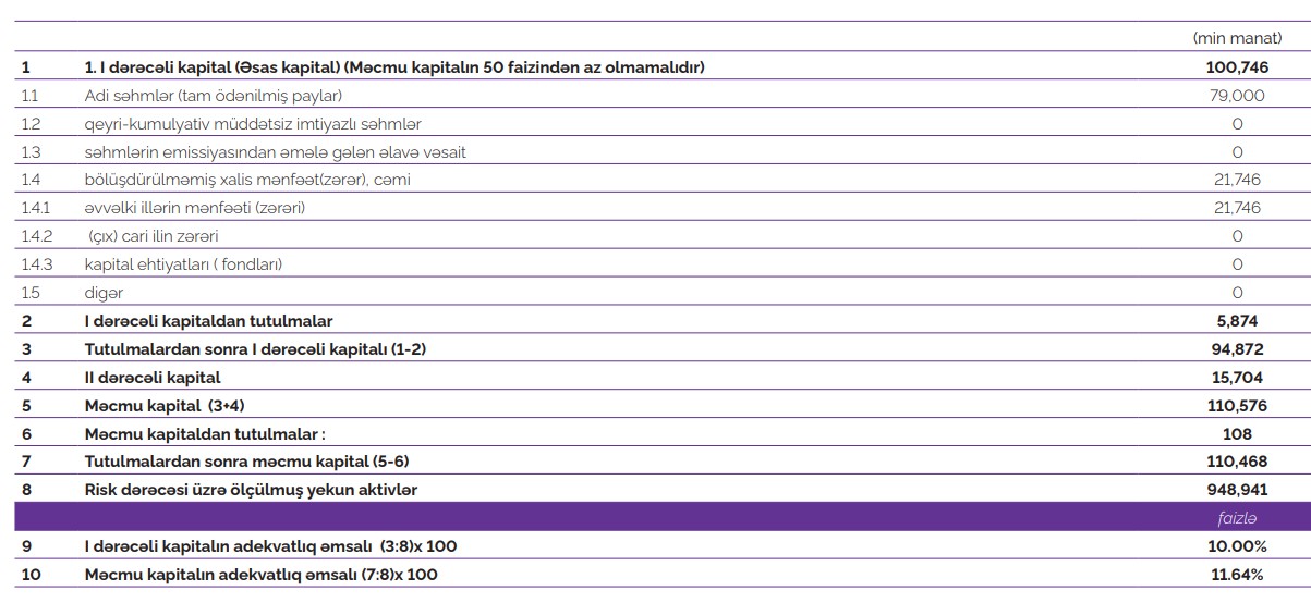 Bankın məcmu kapitalının həcminə gəldikdə isə, bu göstərici ötən ilin eyni dövrü ilə müqayisədə 15% artımla 110,5 milyon manat olmuşdur.