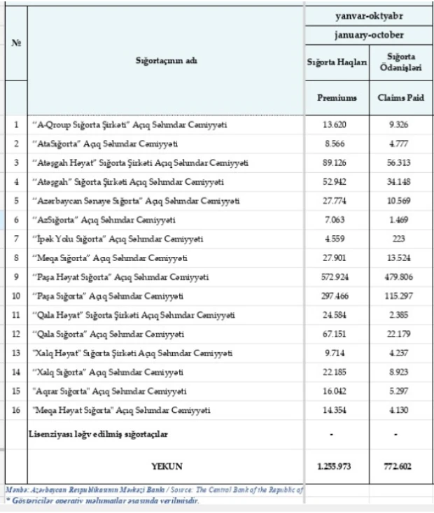 2025-ci ilin yanvar-oktyabr ayları ərzində (10 ayda) Azərbaycanda fəaliyyət göstərən sığorta şirkətləri tərəfindən hesablanmış sığorta haqları və sığorta ödənişləri (min manatla):