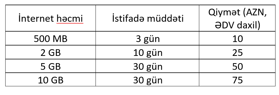 Şirkətin yaydığı məlumata əsasən, xidmət keyfiyyətinin daha da yüksəldilməsi, mobil internetə olan ehtiyacın daim artdığı mühitdə müştərilərə təklif olunan tariflərin optimallaşdırılması, abunəçilərə daha əlverişli və rahat istifadə imkanının təmin edilməsi məqsədi ilə daha sərfəli və abunəçilərin istifadə tələblərinə uyğun yenilənmiş rouminq internet paketləri istifadəyə təqdim edilir.