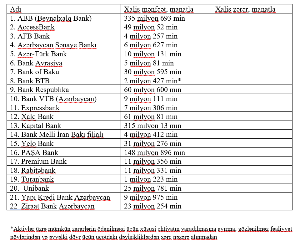 Bankların adları və mənfəət məbləğləri ilə aşağıdakı cədvəldən tanış ola bilərsiniz.