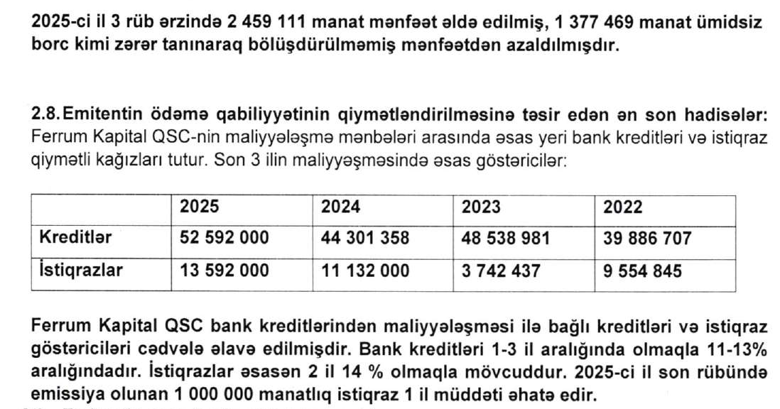 2025-ci ilin sonunda "Fеrrum Kapital"ın götürülmüş kreditlər və buraxılmış istiqrazlar üzrə cəmi 66 milyon 184 min manat borcu olub. 2024-cü ildə şirkətin kredit portfeli 50,6 milyon manat olub. "Fеrrum Kapital" 2025-ci ilin 3 rübü ərzində 2 milyon 459 min manat mənfəət əldə edilib, 1 milyon 377 min manat isə ümidsiz borc kimi zərər tanınaraq bölüşdürülməmiş mənfəətdən azaldılıb.