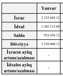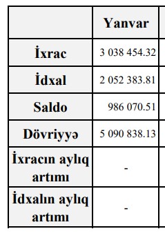 Müqayisə üçün qeyd edək ki, 2025-ci ilin yanvar ayında Azərbaycanın xarici ticarət əməliyyatlarının həcmi 5 milyard 90 milyon 838 min ABŞ dolları, o cümlədən ixrac 3 milyard 38 milyon 454 min ABŞ dolları, idxal 2 milyard 52 milyon 384 min ABŞ dolları, müsbət saldo 986 milyon 70 min ABŞ dolları təşkil etmişdi.