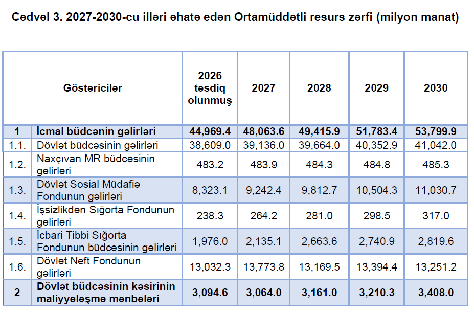 Maliyyə Nazirliyi 2027-ci il və sonrakı üç il üçün dövlət və icmal büdcələrinin ortamüddətli (2027-2030-cu illər) proqnoz göstəriciləri açıqlayıb.
