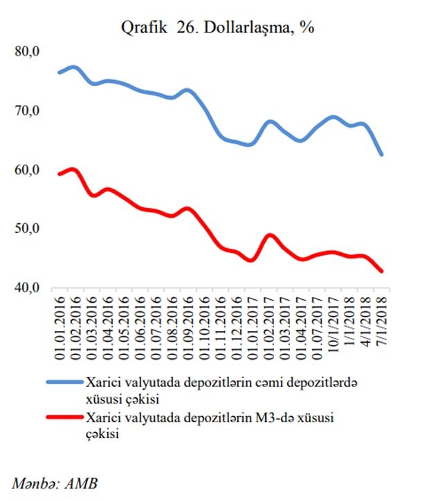 2018-ci ilin I yarımilliyində bank depozitlərinin dollarlaşma səviyyəsində azalma meyili davam etmişdir.