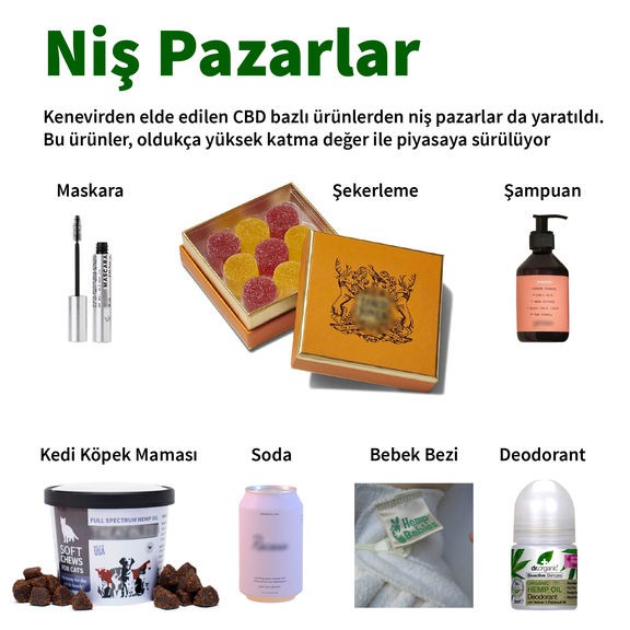 Çətənədən əldə edilən CBD əsaslı məhsullardan niş bazarlar da yaradılıb. Bu məhsullar olduqca yüksək əlavə dəyər ilə bazara çıxarılır. "HERB Essntls" nəmləndirici krem 60 dollardan, "Vertyl" marka dodaq kremi 22 dollardan, bir qutu dezodorant 20 dollardan satılır. CBD ehtiva edən göz qələmi, rimel isə 24 dollardır.