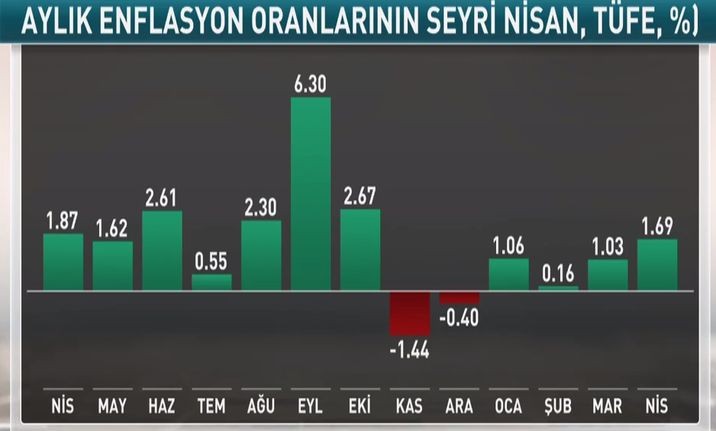 Türkiyə Statistika Komitəsinin məlumatına görə, ölkədə qiymətlər (inflyasiya) Apreldə aylıq 1,69%, illik 19,50% artıb.