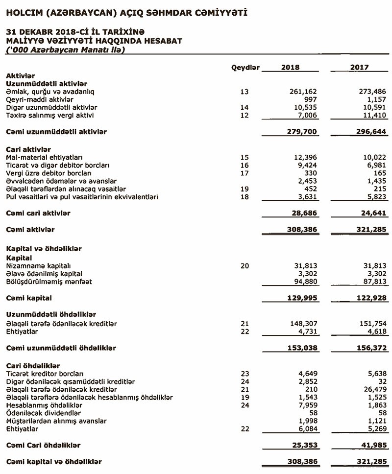 31 Dekabr 2018-ci il tarixində “Holcim Azərbaycan” 308 milyon 386 min manat cəmi aktivlərə malik olub. Sement istehsalçısı 2017-ci ilin sonunda 321 milyon 385 min manat cəmi aktivlərə malik idi.