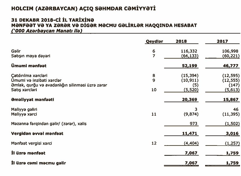 Xərclər və vergilərdən sonra ötən il ASC-nin 7 milyon 67 min manat xalis mənfəəti qalıb. ASC 2017-ci ili 1 milyon 759 min manat xalis mənfəət ilə başa vurmuşdu. Beləliklə, ötən il “Holcim Azərbaycan”ın xalis mənfəəti 4 dəfə artıb.