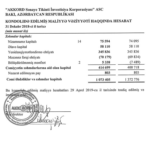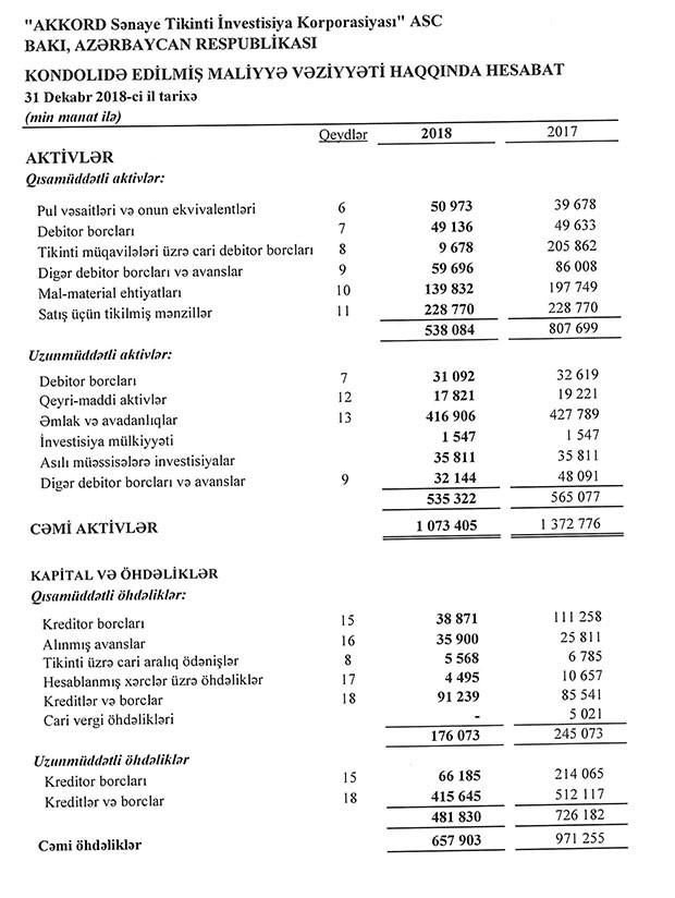 İlllik müqayisədə “Akkord”un cəmi öhdəlikləri 971 milyon 255 min manatdan 657 milyon 903 min manata geriləyib. Öhdəliklərin azalmasına “Akkord”un kredit borclarını qaytarması böyük təsir göstərib. “Akkord”un qısamüddətli kreditor borcları 111 milyon 258 min manatdan 38 milyon 871 min manata, uzunmüddətli kreditor borcları isə 214 milyon 65 min manatdan 66 milyon 185 min manata düşüb.