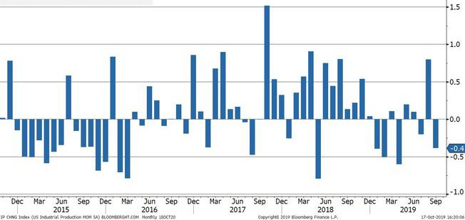 ABŞ-da sənaye istehsalı zəif qlobal tələb və ticarət müharibələrinin təsiri ilə 5 ayın ən böyük tənəzzülünü reallaşdırıb. Fed məlumatlarına görə, sənaye istehsalı Sentyabrda 0.4% düşüb.