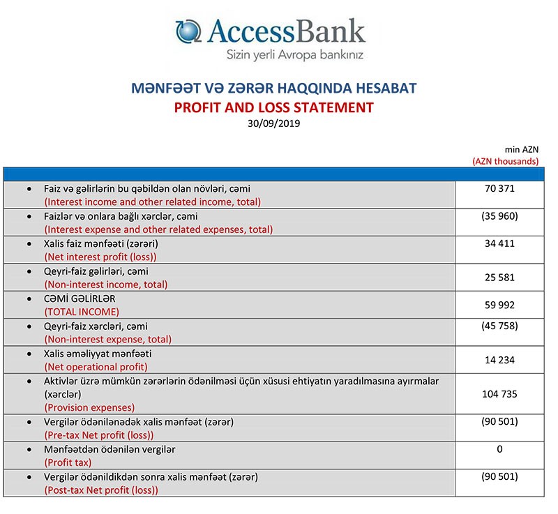 2018-ci ilin yanvar-sentyabr dövründə qeyri-faiz gəlirləri qazanmamış "AccessBank”, 2019-cu ilin eyni dövründə 25 milyon 581 min manat qeyri-faiz gəlirləri əldə edib.