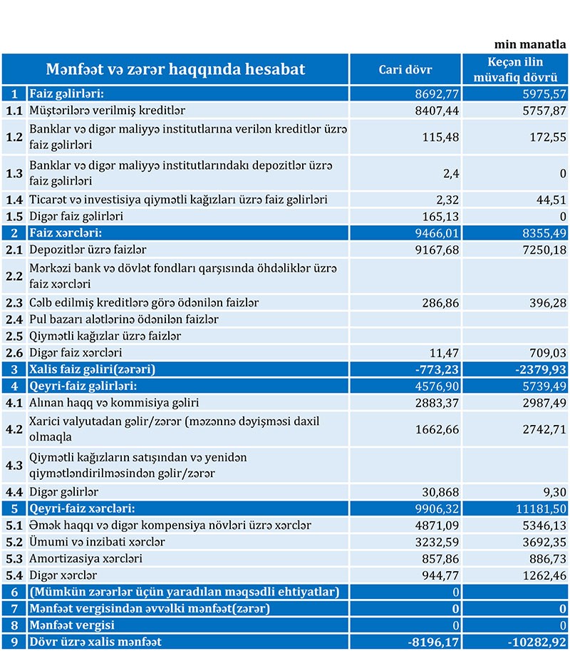 2018-ci ilin yanvar-sentyabr dövrü ilə müqayisədə 2019-cu ilin yanvar-sentyabr dövründə faiz xərcləri 1 milyon 111 min manat artaraq 9 milyon 466 min manat, qeyri-faiz xərcləri isə 1 milyon 275 min manat azalaraq 9 milyon 906 min manat təşkil edib.