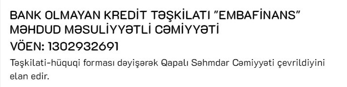 Bank olmayan Kredit təşkilatı "Embafinans" MMC təşkilati-hüquqi formasını dəyişib.