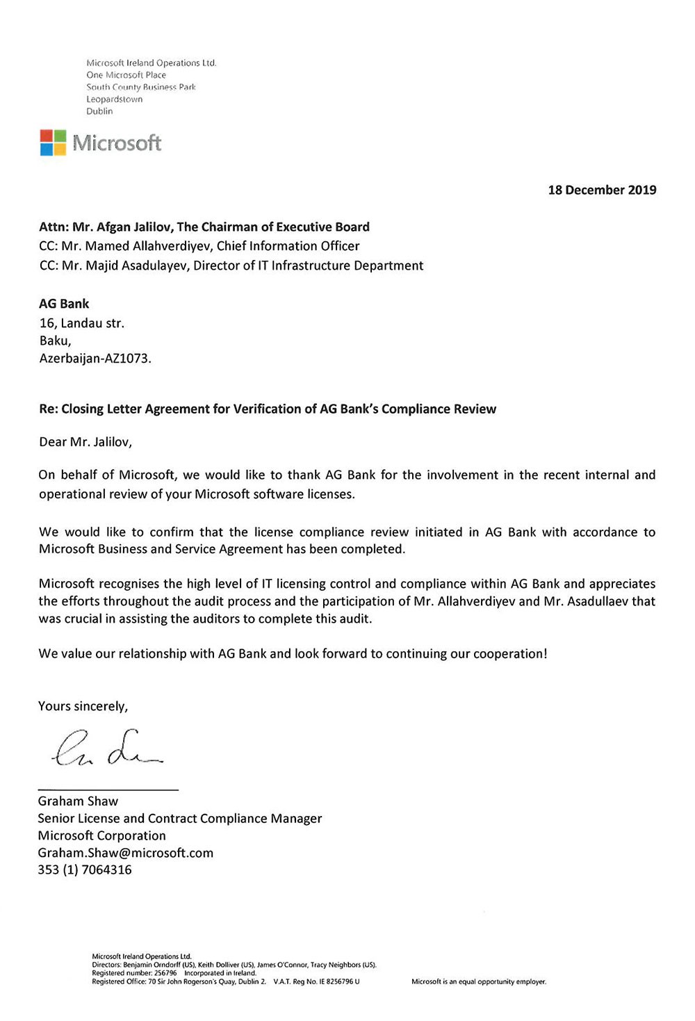 (®) Azərbaycanın aparıcı banklarından olan “AGBank” “Microsoft” şirkəinin proqram təminatının lisenziyasına uyğunluq auditindən uğurla keçib.