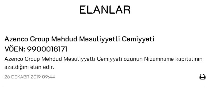 "Azenco Group" Məhdud Məsuliyyətli Cəmiyyəti özünün nizamnamə kapitalının azaldığını elan edir.