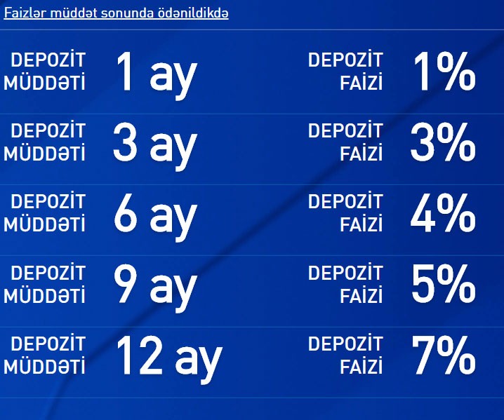 “Marja” xəbər verir ki, faiz dərəcəsi 3 faiz bəndi azaldılıb. Belə ki, illik faiz dərəcəsi “faizlər aylıq ödənildikdə” şərti üzrə 9%-dən 6%-ə, “faizlər müddət sonunda ödənildikdə” şərti üzrə isə 10%-dən 7%-ə endirilib.