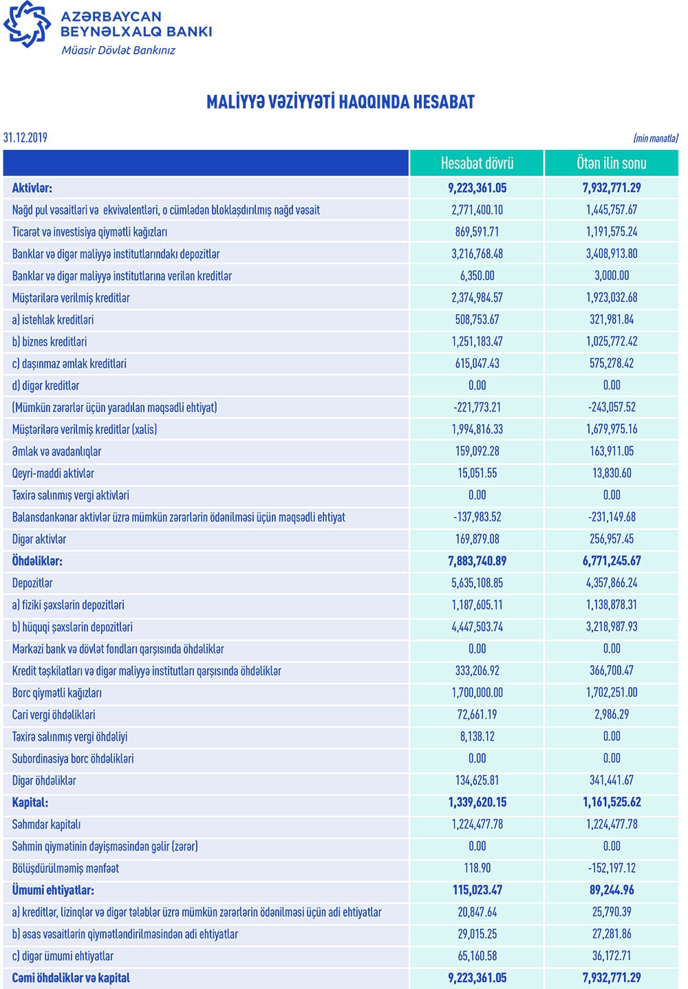 “Azərbaycan Beynəlxalq Bankı” ASC 2019-cu ili 302 milyon 316 min manat xalis mənfəət ilə başa vurub. 2018-ci illə müqayisədə 2019-cu ildə Beynəlxalq Bankın xalis mənfəəti 123 milyon 524 min manat və ya 29% azalıb. Belə ki, Bank 2018-ci ili 425 milyon 841 min manat xalis mənfəət ilə başa vurmuşdu. Mənfəətin azalması, Beynəlxalq Bankın gəlirlərinin azalmasından deyil, əvvəlki illər yaradılmış ehtiyatdan azadolmanın azalması və ötən il mənfəət vergisinin ödənilməsi ilə bağlıdır.