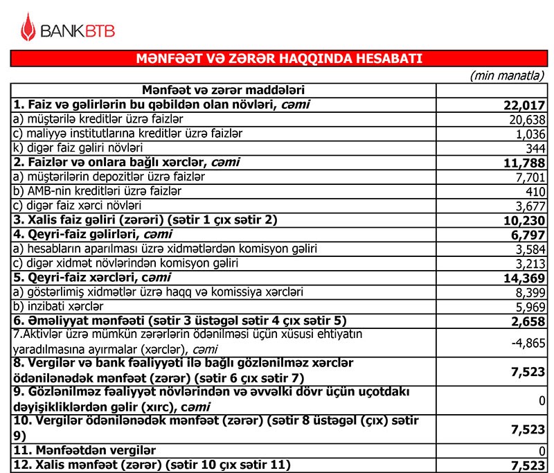 Bank BTB 2019-cu ili 7 milyon 523 min manat xalis mənfəət ilə başa vurub.