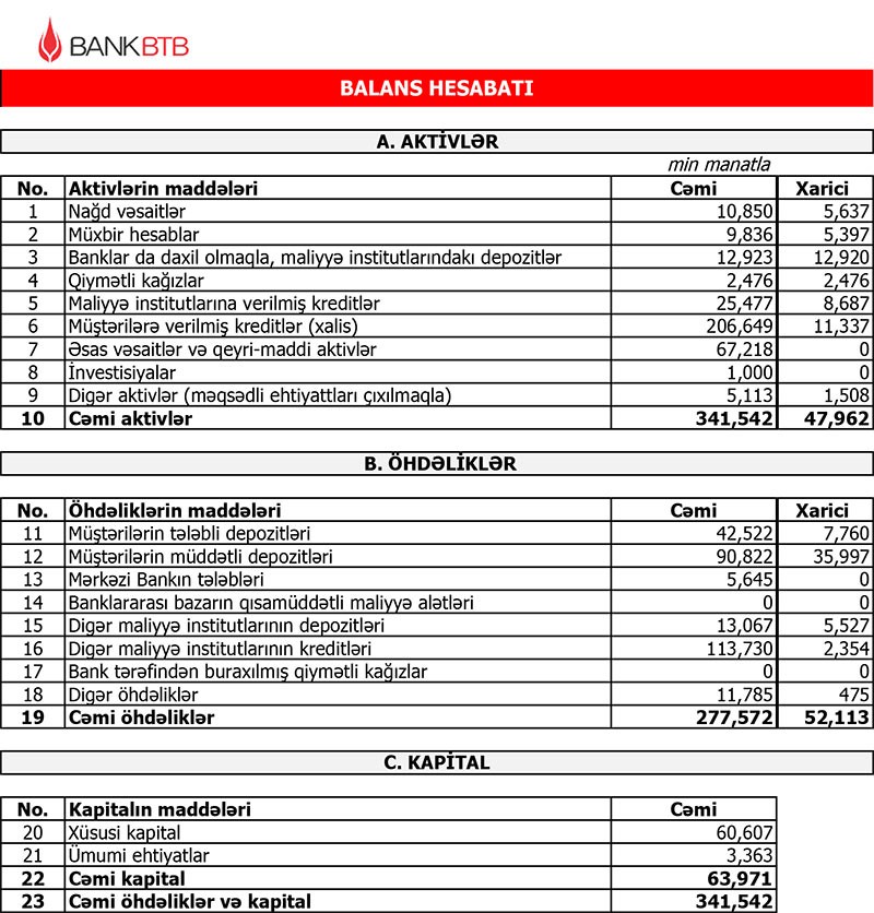 Müqayisə üçün qeyd edək ki, 2018-ci ildə “Bank BTB”nin cəmi gəlirləri 25 milyon 657 min manat, cəmi xərcləri 24 milyon 226 min manat təşkil etmiş, həmin il 1 milyon 431 min manat əməliyyat mənfəəti əldə etmişdi. Əməliyyat mənfəətinin 726 min manatı aktivlər üzrə mümkün zərərlərin ödənilməsi üçün xüsusi ehtiyatın yaradılmasına ayırıldığından Bank 2018-ci ili 704 min manat xalis mənfəət ilə başa vurmuşdu.
