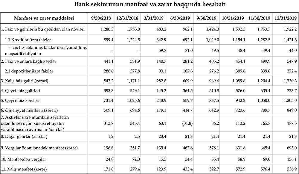 Ötən il bankların qeyri-faiz gəlirləri 174.6 milyon manat və ya 32% artaraq 723.7 milyon manata yüksəlib. 2018-ci ildə bankların qeyri-faiz gəlirləri 549.1 milyon manat təşkil etmişdi.